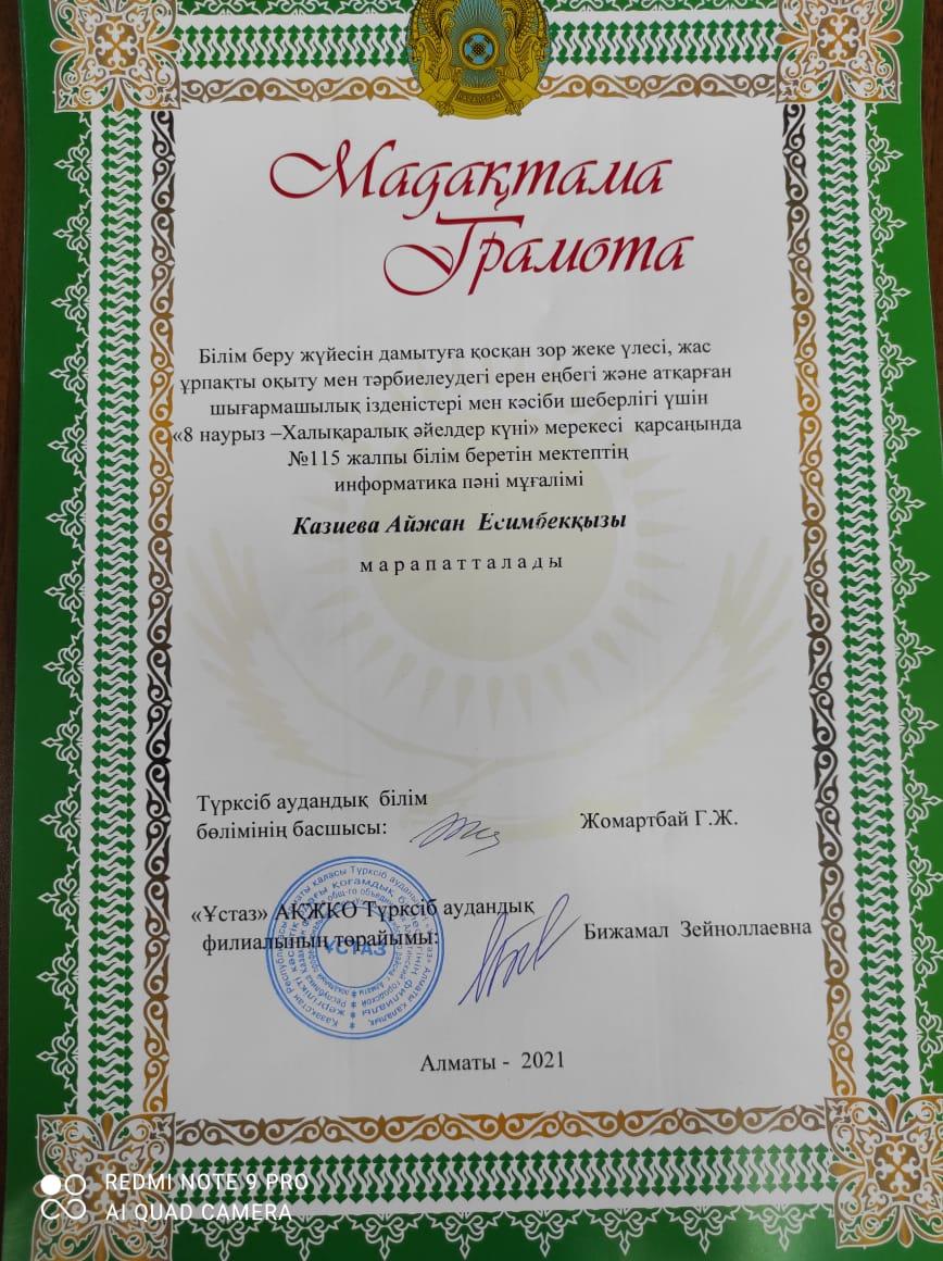 Білім беру жүйесін дамытуға қосқан зор жеке үлесі , жасұрпақты оқыту мен тәрбиелеудегі ерен еңбегі және атқанған шығармашылық ізденістері мен кәсіби шеберлігі үшін "8 наурыз-Халықаралық әйелдер күні" мерекесінде мадақтау қағазымен Омирзакова А.Б, Қазиева А марапатталды.