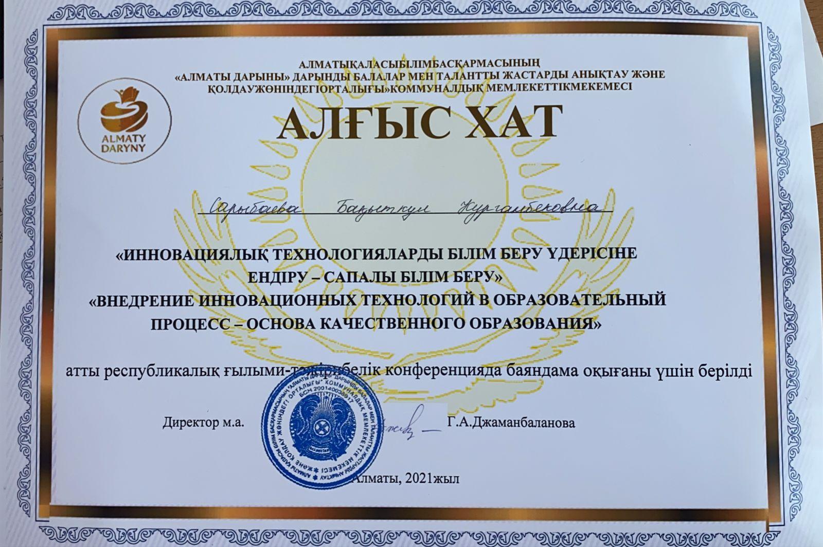 21 август 2021 0 1 2 3 4 5 Алғыс хат "Инновациялық технологияларды білім беру үрдісіне ендіре-сапалы білім беру" Сарыбаева Бақытгуль "Алғыс хат" Осы беттің QR-коды:QR-код этой страницы: