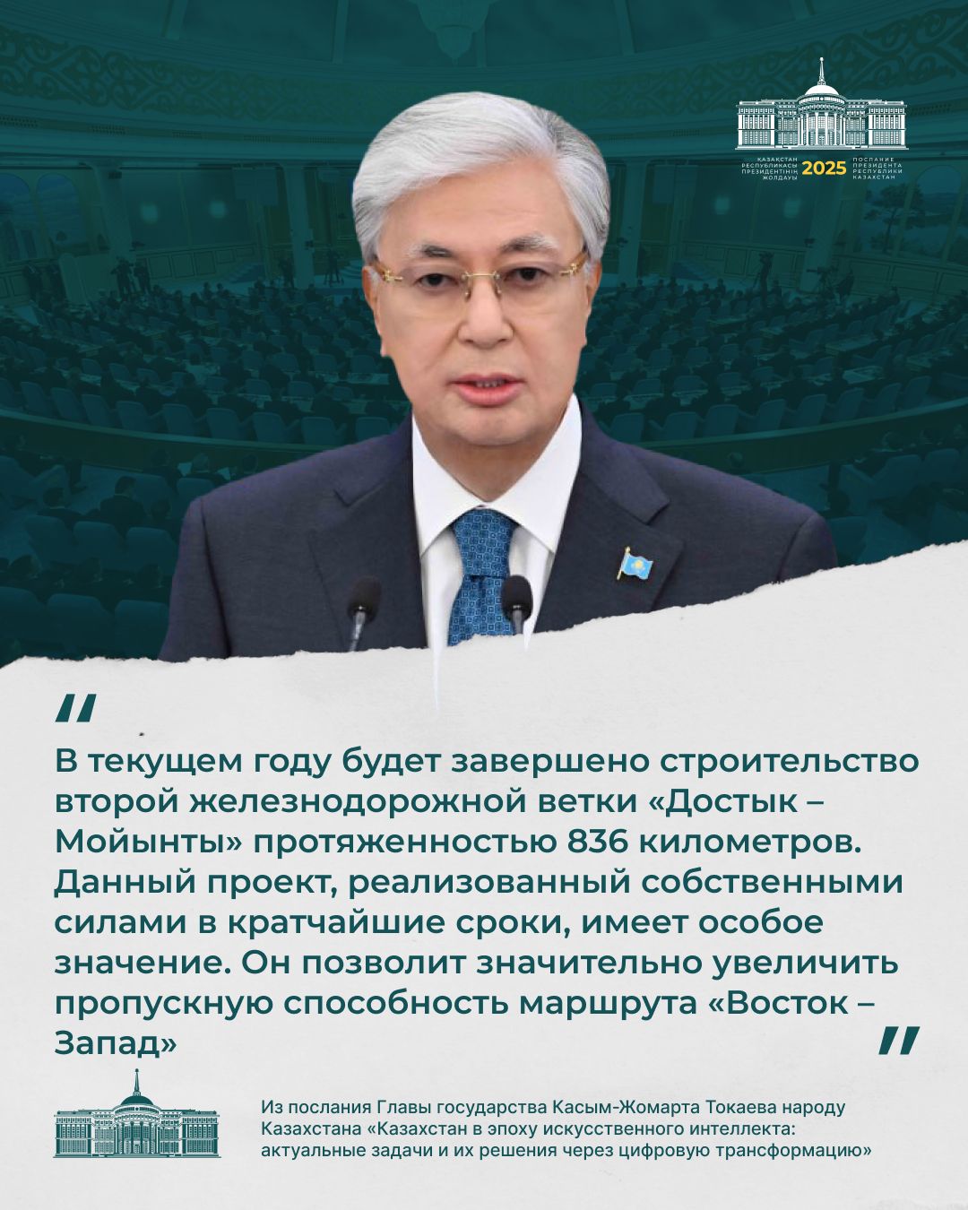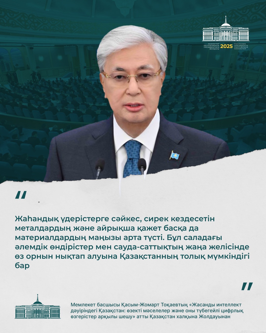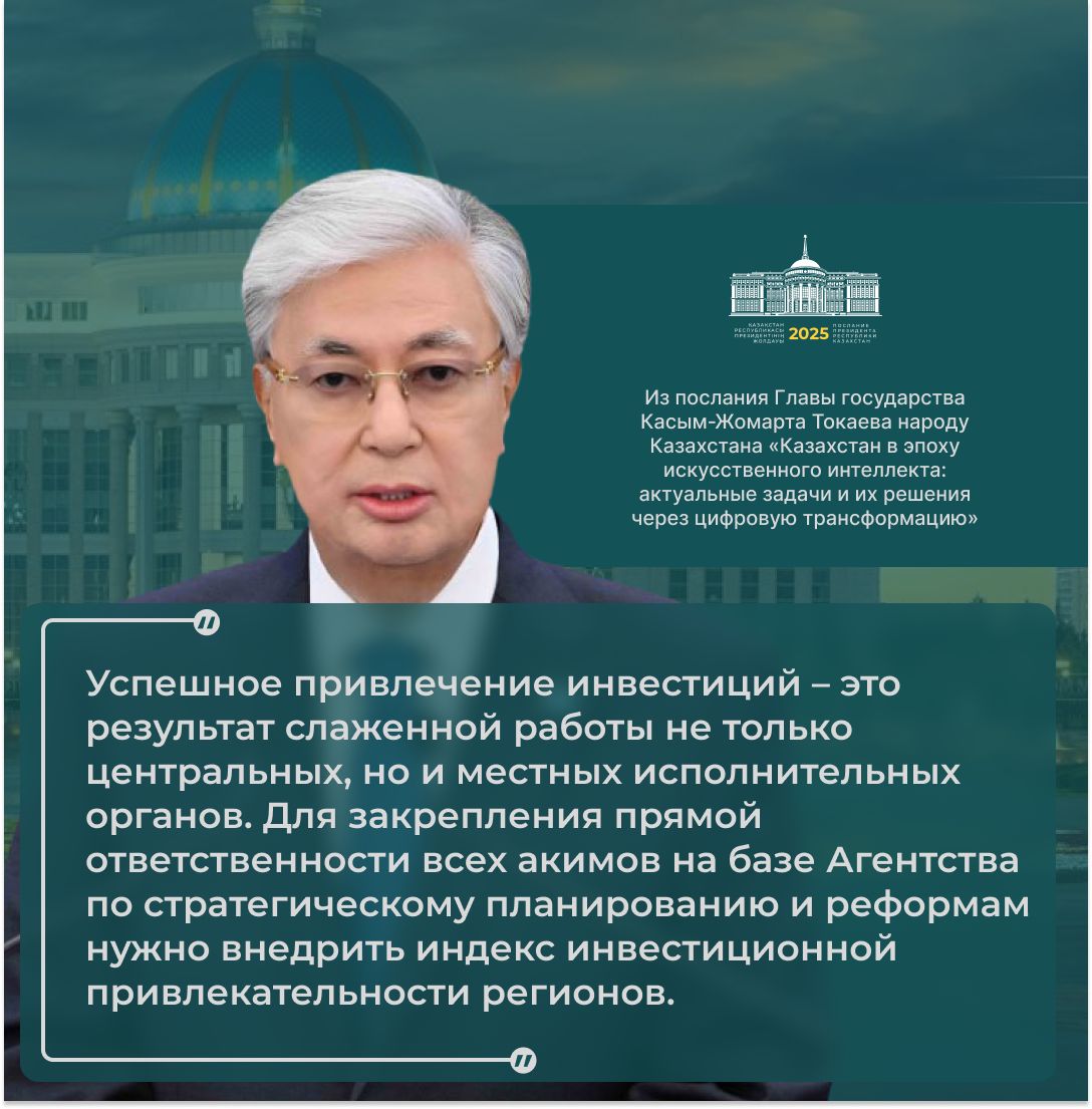 – Бұл технология әлемдегі барлық елдің дамуына тікелей әсер етуде. Қазір онсыз жаһандық бәсекеге төтеп беру мүмкін емес. Озық технологиялар ұлт дербестігінің кепіліне, экономикалық өсімнің қозғаушы күшіне айналуда. Біз жасанды интеллект саласында бірқатар жетістікке қол жеткіздік, бірақ босаңсуға болмайды. Осы стратегиялық бағытта табанды жұмыс істеуіміз керек. Бұл жұмысқа мен ең маңызды басымдықтың бірі ретінде қараймын. Біріккен Ұлттар Ұйымының Сауда және даму жөніндегі конференциясының (UNCTAD) болжамы бойынша 2033 жылға қарай жасанды интеллект нарығының ауқымы 4,8 триллион долларға жетуі мүмкін. Ал оның ғаламдық технологиялық индустриядағы үлесі 7 пайыздан 29 пайызға дейін артады. Бұл, әрине, теңдесі жоқ өсім болмақ. Жасанды интеллект дамудың жаңа мүмкіндіктеріне кеңінен жол ашады, – деді Мемлекет басшысы.