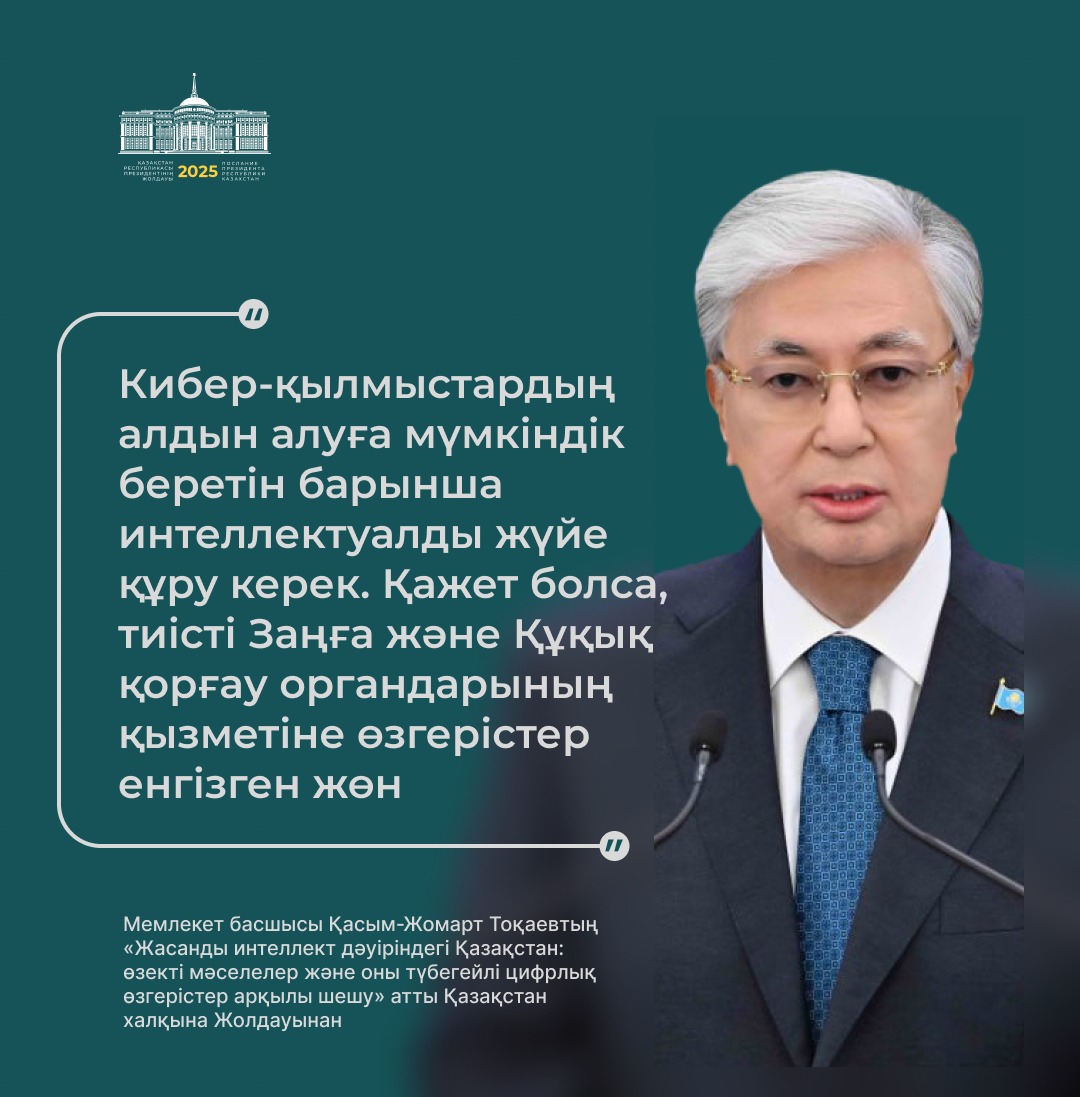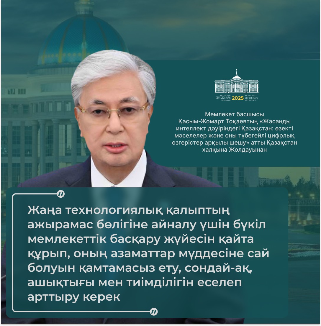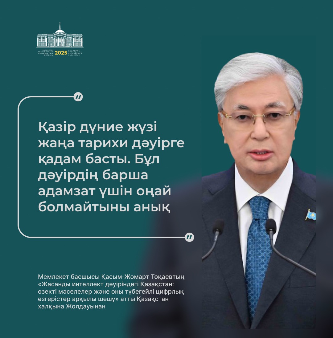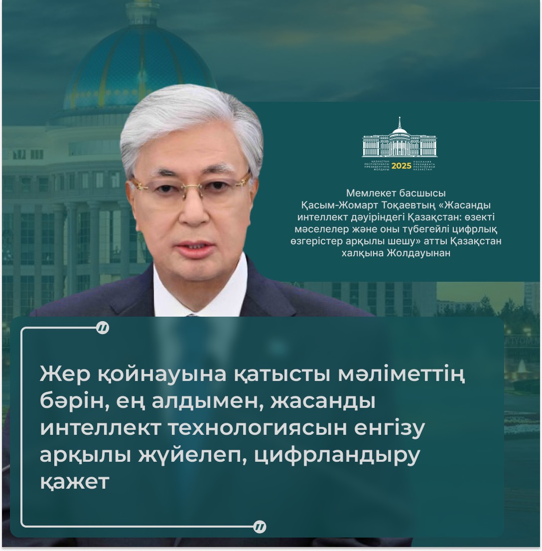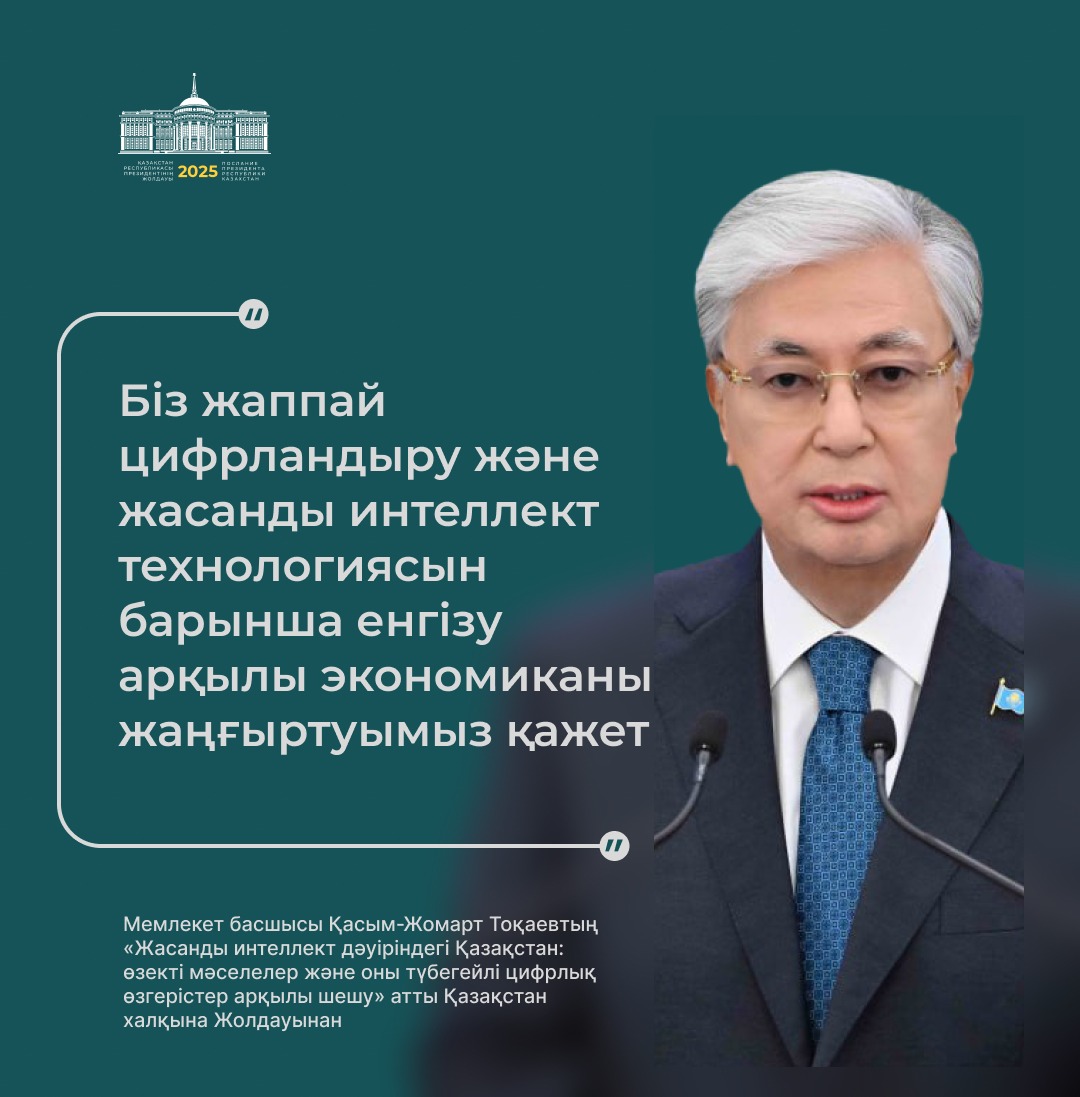 Президент қазір дүние жүзінде жасанды интеллектінің қарқынды дамуына байланысты сипаты мүлде жаңа технологиялық өзгерістер болып жатқанын атап өтті.