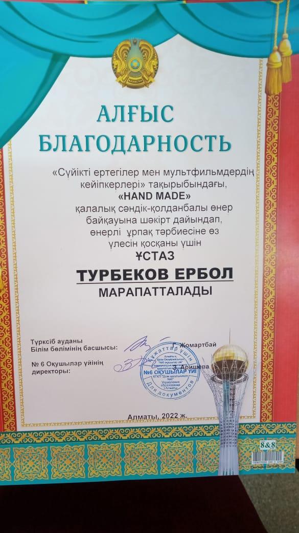 21 май 2022 0 1 2 3 4 5 Алғыс "Сүйікті ертегілермен мультфильмдердің кейіпкерлері" тақырыбындағы "HAND MADE" қалалық сәндік -қолданбалы өнер байқауына шәкірт дайындап , өнерлі ұрпақ тәрбиесіне өз үлесін қосқаны үшін "Алғыс" Турдеков Ербол марапатталды. Осы беттің QR-коды:QR-код этой страницы: