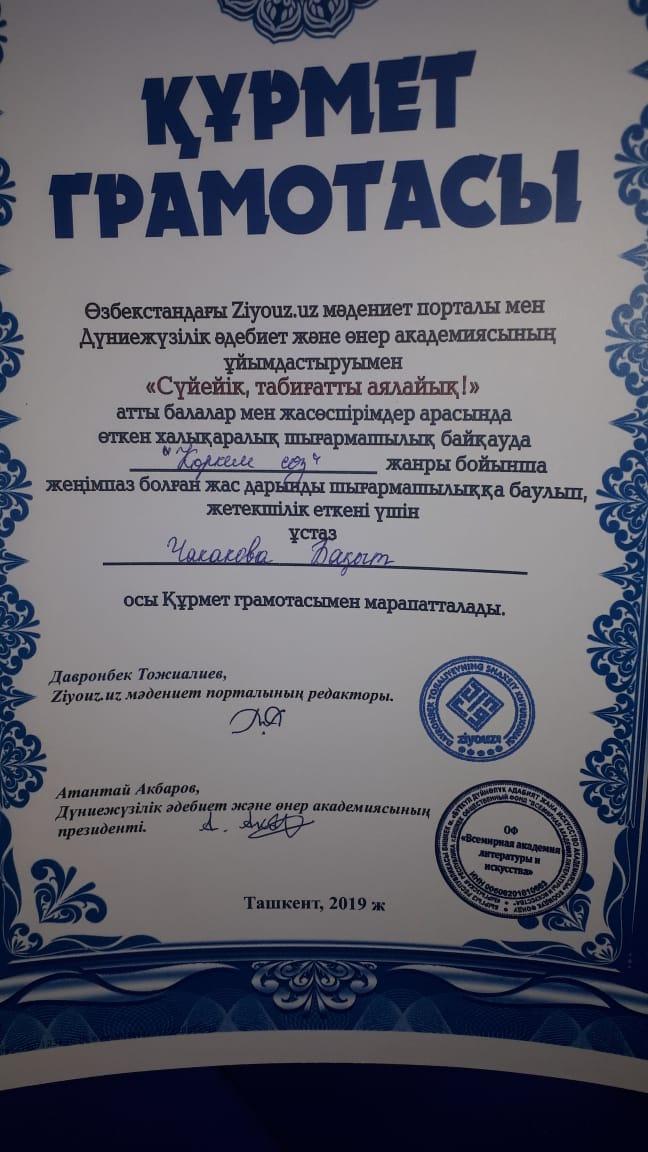 "Сүйейік, табиғатты аялайық!" атты халықаралық байқауда Көркем сөз жанры бойынша жас дарынға жетекшілік еткен Чакакова Бақыт Құрмет грамотасымен марапатталды.