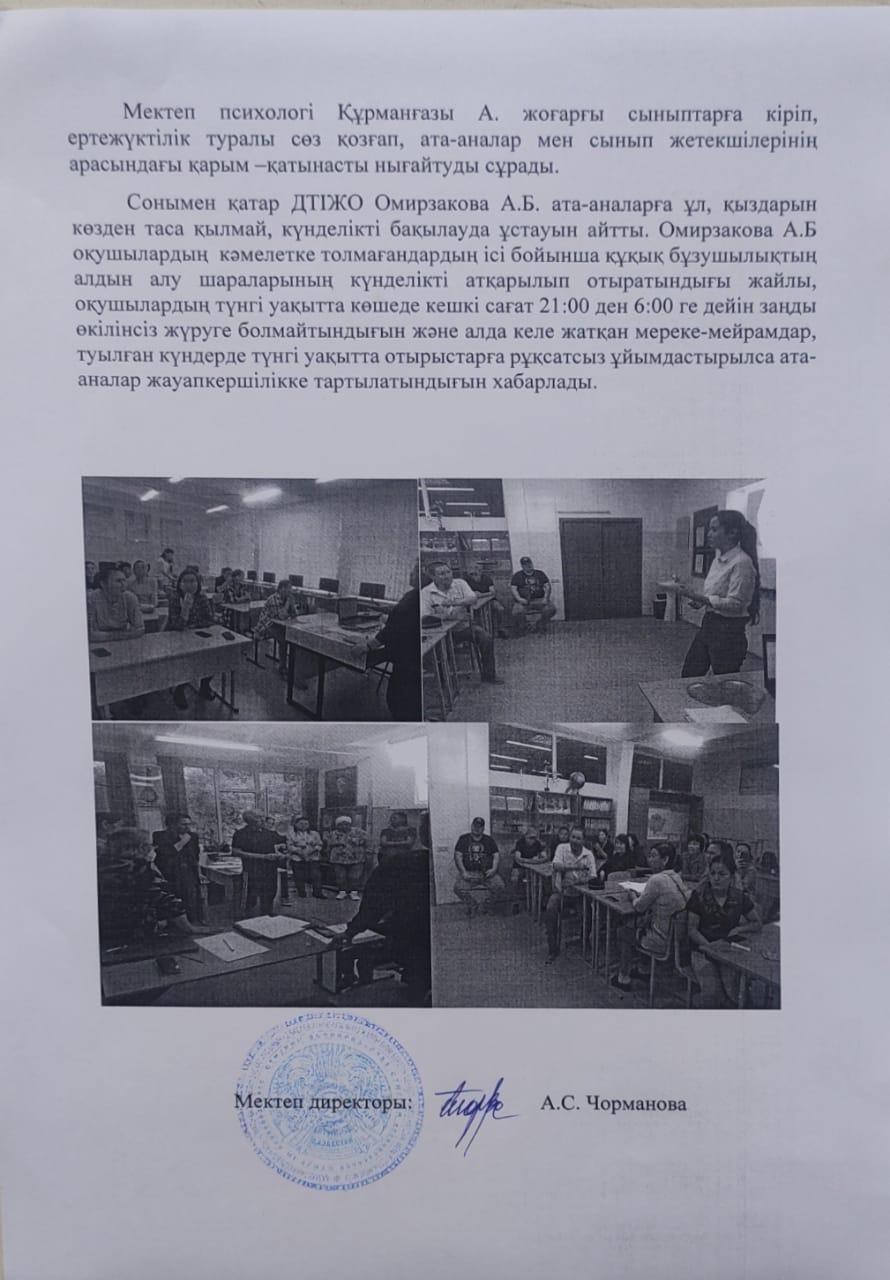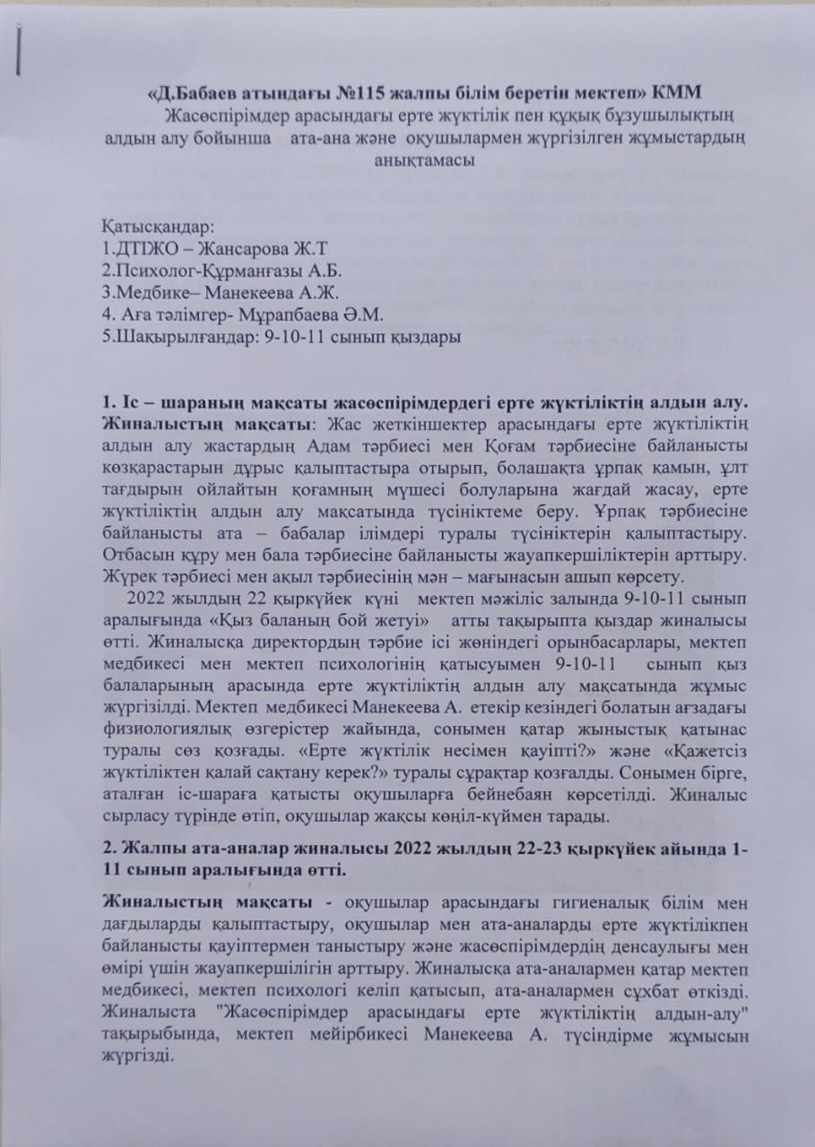 Жасөспірімдер арасындағы ерте жүктілік пен құқық бұзушылықтың алдын алу бойынша ата-ана және оқушылармен жүргізілген жұмыстардың анықтамасы
