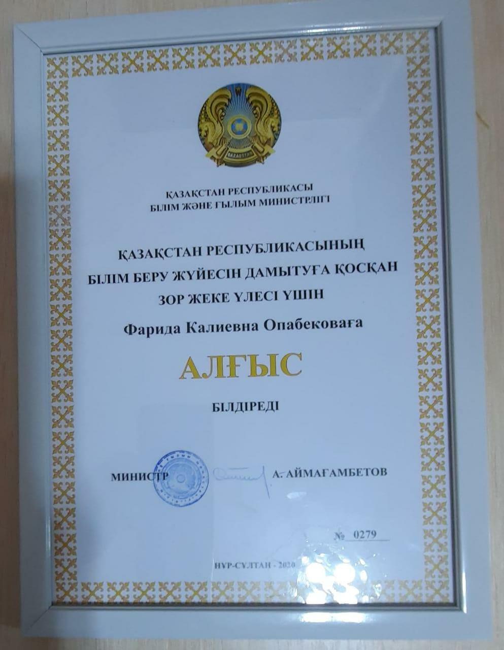 13 октябрь 2020 0 1 2 3 4 5 Алғыс Қазақстан Республикасының Білім беру жүйесін дамытуға қосқан зор жеке үлесі үшін Опабекова Фарида Калиевна марапатталды. Осы беттің QR-коды:QR-код этой страницы: