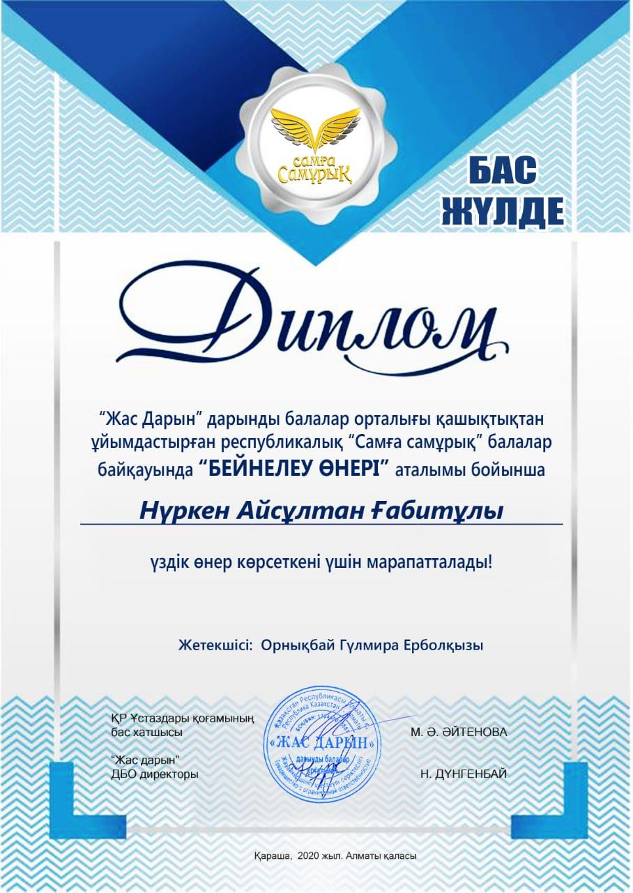 20 ноябрь 2020 0 1 2 3 4 5 Диплом "Жас дарын" дарынды балалар орталығы қашықтықтан ұйымдастырған "Самға самұрық" байқауы бойыншы бас жүлде Нүркен Айсұлтан Ғабйтұлы марапатталды. Осы беттің QR-коды:QR-код этой страницы: