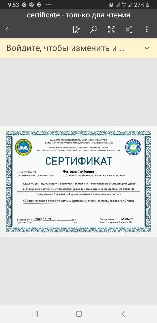 23 ноябрь 2020 0 1 2 3 4 5 Сертификат Қашықтықтан оқыту сабақты әзірлеуден бастап білім берупроцесін ұйымдастыру курысын аяқтады Таубаева Фатима Осы беттің QR-коды:QR-код этой страницы: