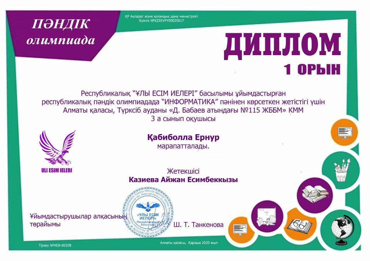 24 ноябрь 2020 0 1 2 3 4 5 Диплом Респуликалық "Ұлы есім иелері" басылымы ұйымдастырған республикалық пәндік олимпиадада "Информатика" пәнінен көрсеткен жетістігі үшін 1 орын 3 "А" сынып оқушысы Қабиболла Ернур марапатталды. Осы беттің QR-коды:QR-код этой страницы: