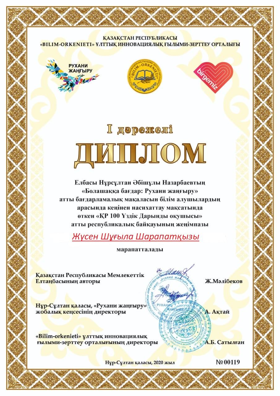 Елбасы Н.Ә.Назарбаевтың "Болашаққа бағдар: Рухани жаңғыру" атты бағдарламалық мақаласын білім алушылардың арасындағы кеңінен насихаттау мақсатында өткен " ҚР 100 Үздік Дарынды оқушысы " атты республикалық байқауының жеңімпазы Жүсен Шұғыла Шарапатқызы І дәрежелі дипломмен марапатталды.