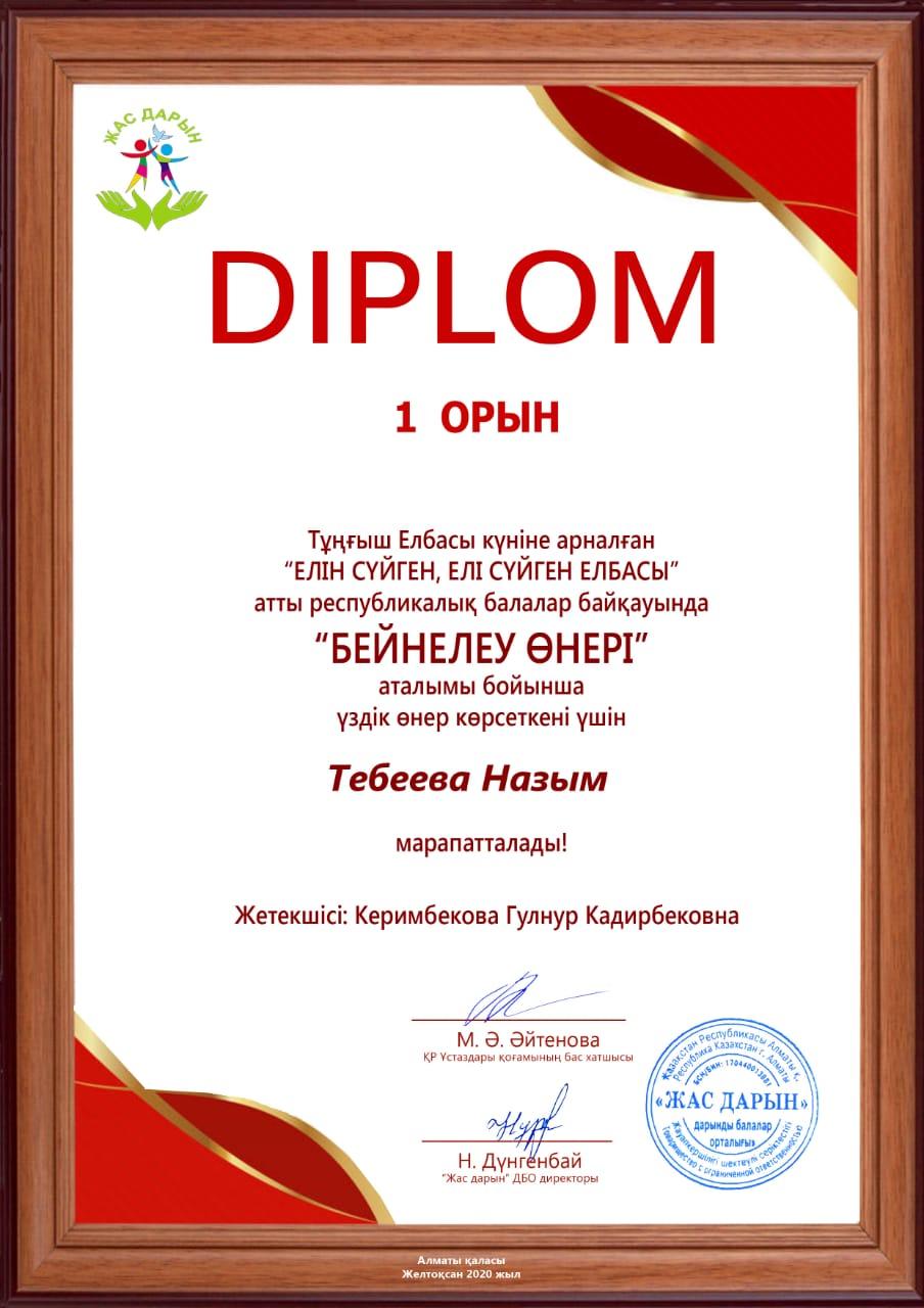 16 январь 2021 0 1 2 3 4 5 Диплом Тұңғыш Елбасы күніне арналған "Елін сүйген, елі сүген Елбасы" республикалық "Бейнелеу өнері" бойынша 1 орынТебеева Назым марапатталды Осы беттің QR-коды:QR-код этой страницы: