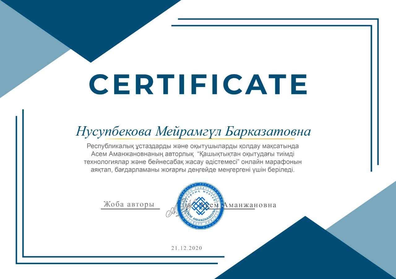 19 январь 2021 0 1 2 3 4 5 Сертификат Республикалық ұстаздарды және оқытушыларды қолдау мақсатында Асем Аманжанованың авторлық "Қашықтықтан оқытудағы тиімді технологиялар және бейнесабақ жасау әдістемесі" онлайын аяқтады. Осы беттің QR-коды:QR-код этой страницы: