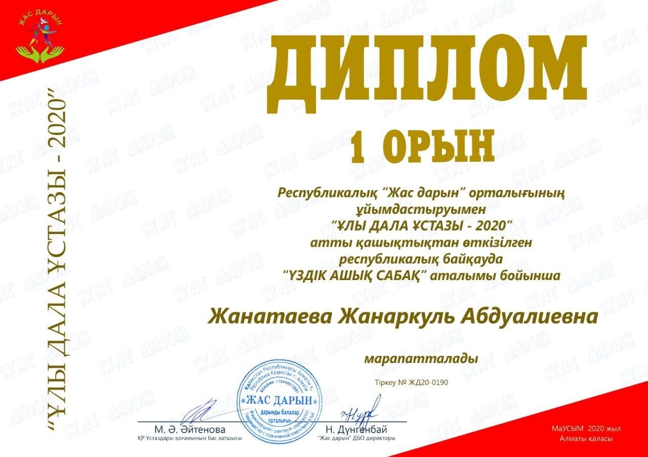22 январь 2021 0 1 2 3 4 5 Диплом Республикалық "Жас дарын" орталығының ұйымдастырумен "Ұлы дала ұстазы-2020" атты қашықтықтан өткізілген республикалық байқауда "Үздік ашық сабақ" аталымы бойынша І орын Жанатаева Жанаркуль марапатталды. Осы беттің QR-коды:QR-код этой страницы: