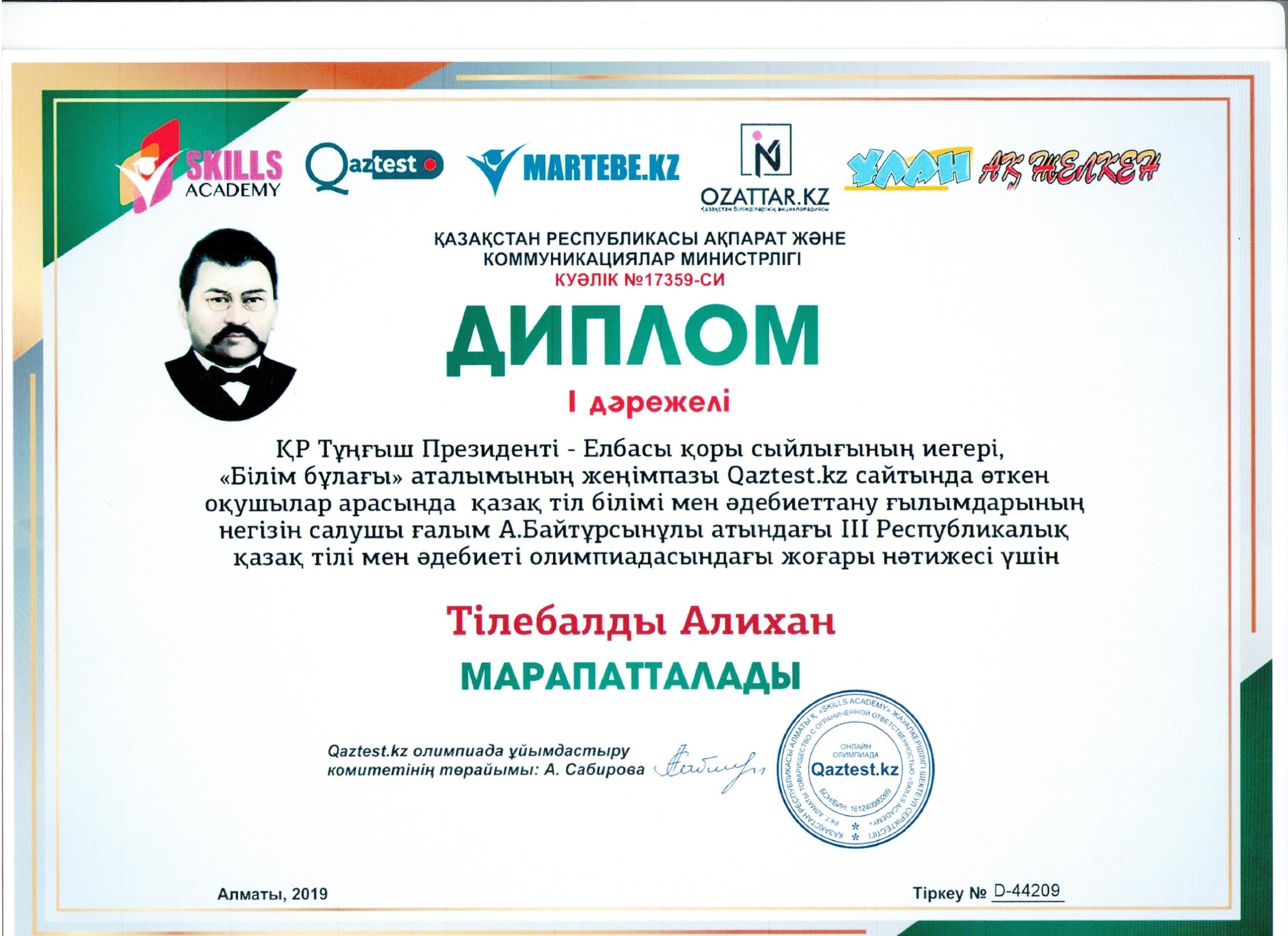 25 январь 2021 0 1 2 3 4 5 Диплом ҚР Тұңғыш Президенті-Елбасы қоры сыйлығының иегері, "Білім бұлғы" аталымының жеңімпазы Тілепалды Алихан. Осы беттің QR-коды:QR-код этой страницы: