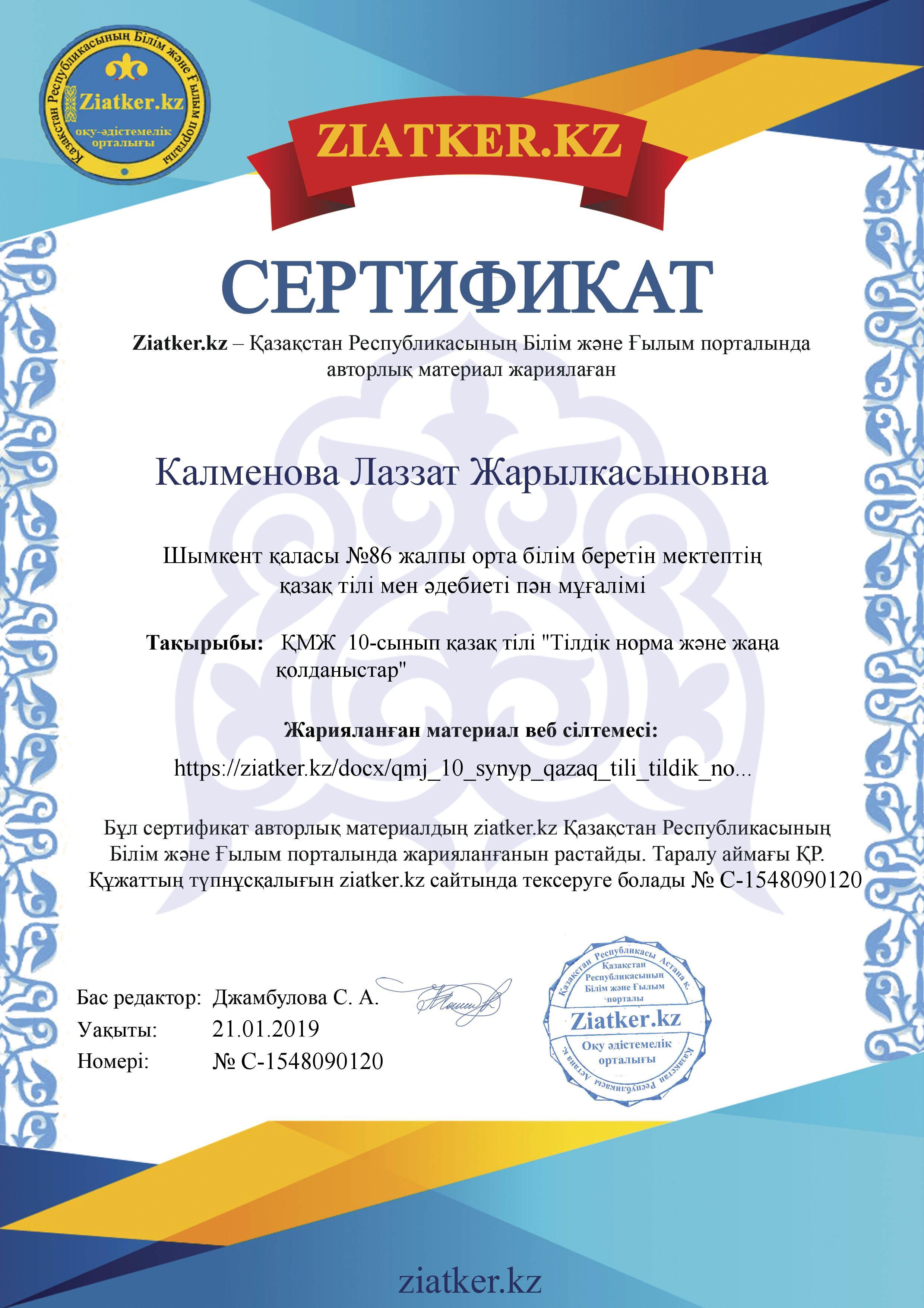 28 январь 2021 0 1 2 3 4 5 Сертификат ҚМЖ 10 сыныптарға арналған "Тілдік норма және жаңа қолданыстар" жарияланған материалдар үшін Калменова Лаззат Жарылкасыновна сертификатпен марапатталды. Осы беттің QR-коды:QR-код этой страницы: