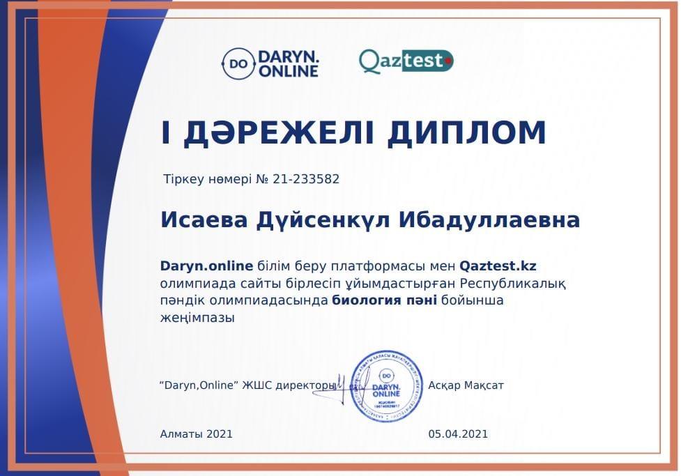19 апрель 2021 0 1 2 3 4 5 Диплом Daryn.online білім беру платформасы мен Qaztest.kz олимпиадасы сайты бірлесіп ұйымдастырған Республикалық пәндік олимпиадасында биология пәні бойынша І дәрежелі диплом Исаева Дүйсенгүл марапатталды. Осы беттің QR-коды:QR-код этой страницы: