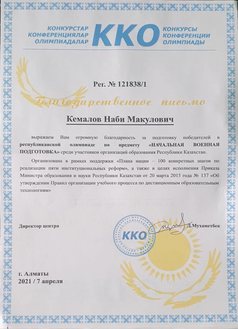 22 апрель 2021 0 1 2 3 4 5 Благодарственное письмо Олимпиада по предмету "Начальная военная подготовка" среди учиников организации РК блогадарность Кемалов Наби Макуловичу. Осы беттің QR-коды:QR-код этой страницы: