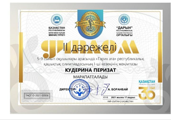 23 апрель 2021 0 1 2 3 4 5 диплом 5-9сыныптар арасында "Тарих ата" республикалық қашықтық олимпиадасының ІІ ші дәрежелі дипломмен Кудерина Перизат марапатталды. Осы беттің QR-коды:QR-код этой страницы: