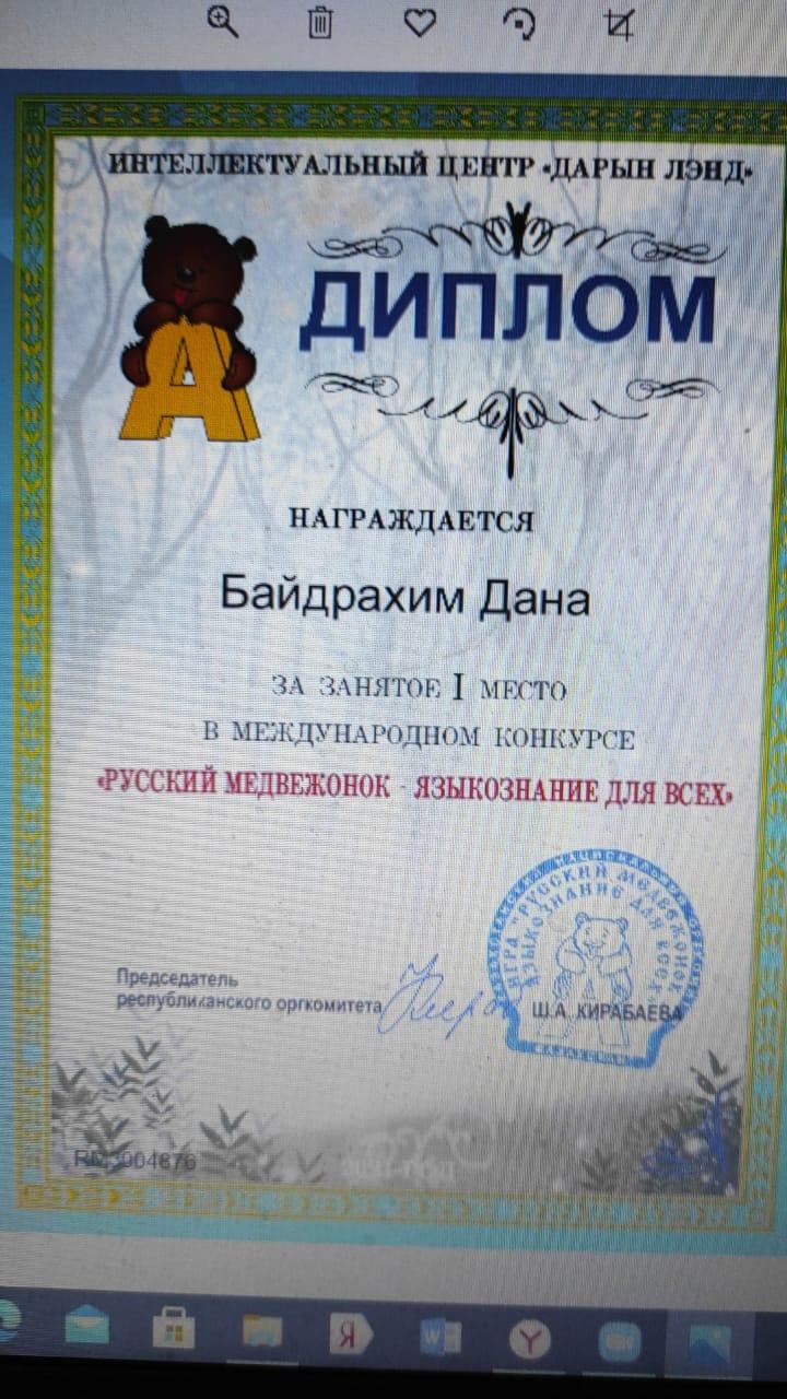 12 май 2021 0 1 2 3 4 5 Диплом За занятое І место в междунородном конкурсе Байдрахим Дана "Русский медвежонок-языкознание для всех" Осы беттің QR-коды:QR-код этой страницы: