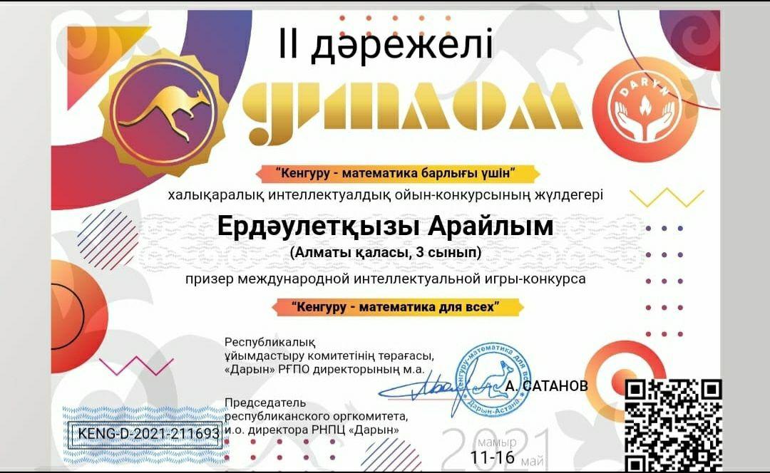 05 июль 2021 0 1 2 3 4 5 Диплом "Кенгру математика барлығы үшін" халықаралық интелектуалдық ойын-конурсының жүлдегері Ердаулетқызы Арайлым ІІ дәрежелі дипломмен марапатталды. Осы беттің QR-коды:QR-код этой страницы: