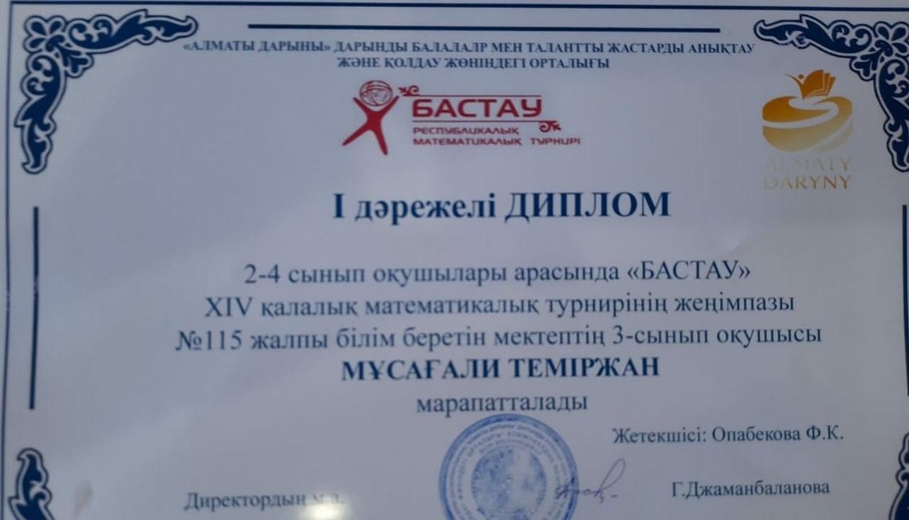 09 июль 2021 0 1 2 3 4 5 Диплом 2-4 сынып оқушылары арасында "Бастау" ХІV қалалық математикалық турнир жүлдегері Мусагали Темірдан І дәрежелі дипломмен марапатталды. Осы беттің QR-коды:QR-код этой страницы: