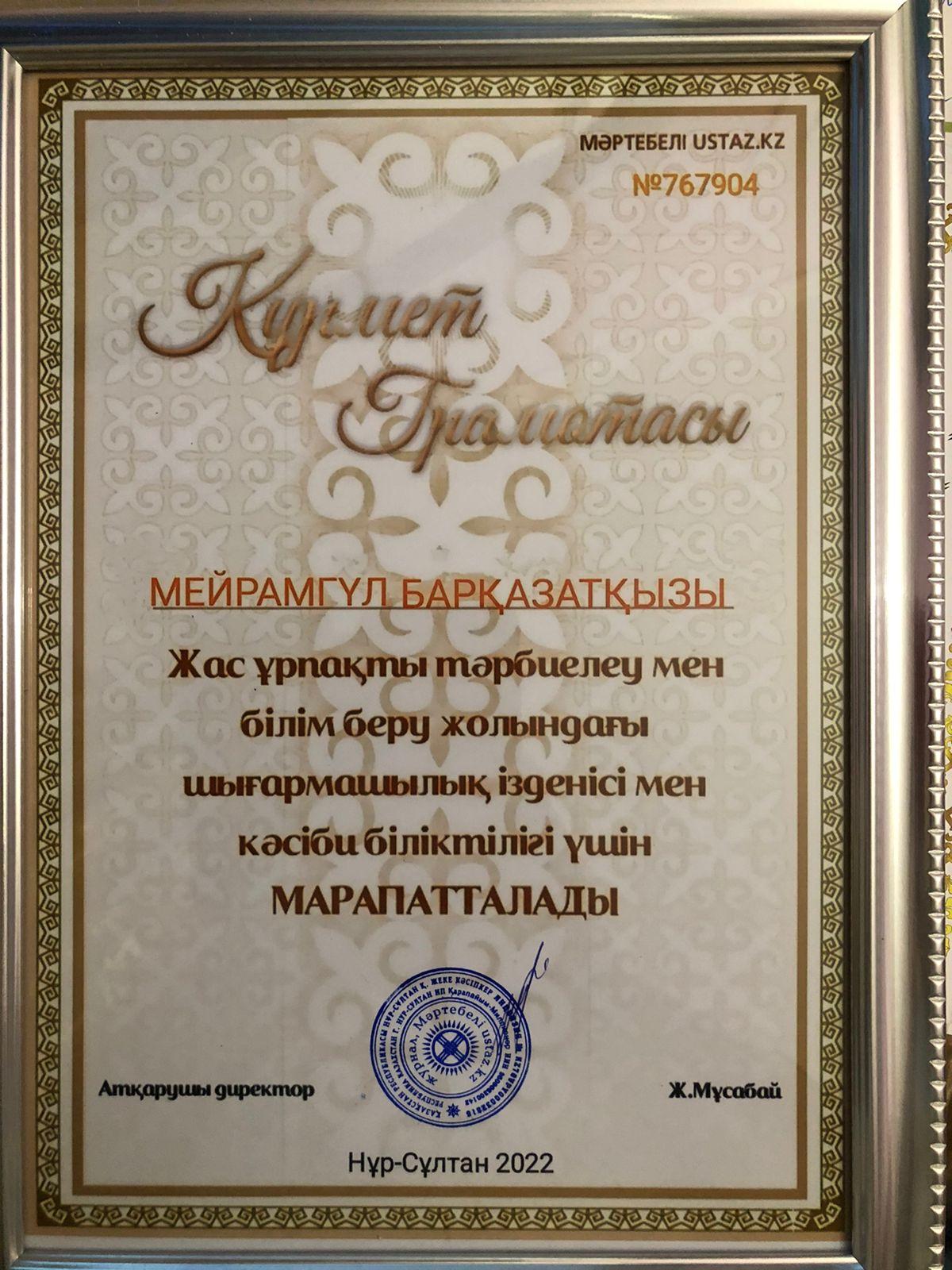 18 август 2022 0 1 2 3 4 5 Құрмет грамотасы Жас ұрпаққа тәрбиелеу мен білім беру жолындағы шығармашылық ізденістері мен кәсіби біліктілігі үшін Нүсүпбекова Мейрамгүл Барқазатқызы марапатталды. Осы беттің QR-коды:QR-код этой страницы:
