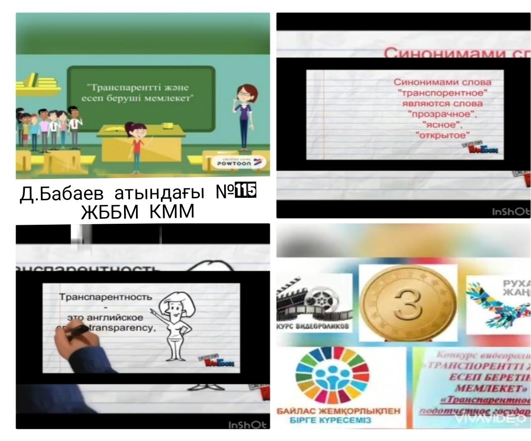 12-17.04.2021 жыл аралығында «Транспарентті және есеп беруші мемлекет» атты тақырыпта 1-11 сынып оқушыларына арнайы дайындалған бейнероликтер көрсетілді. Қоғамның ашық және есеп беретін мемлекет қалыптастыруға бағытталған міндеттерді шешуде Қазақстанның жетістіктерін көрсету; мектептерде жоғары адамгершілік, жауапты, бастамашылық және әлеуметтік құзыретті азамат пен патриотты қалыптастыру және дамыту үшін жағдай жасау;