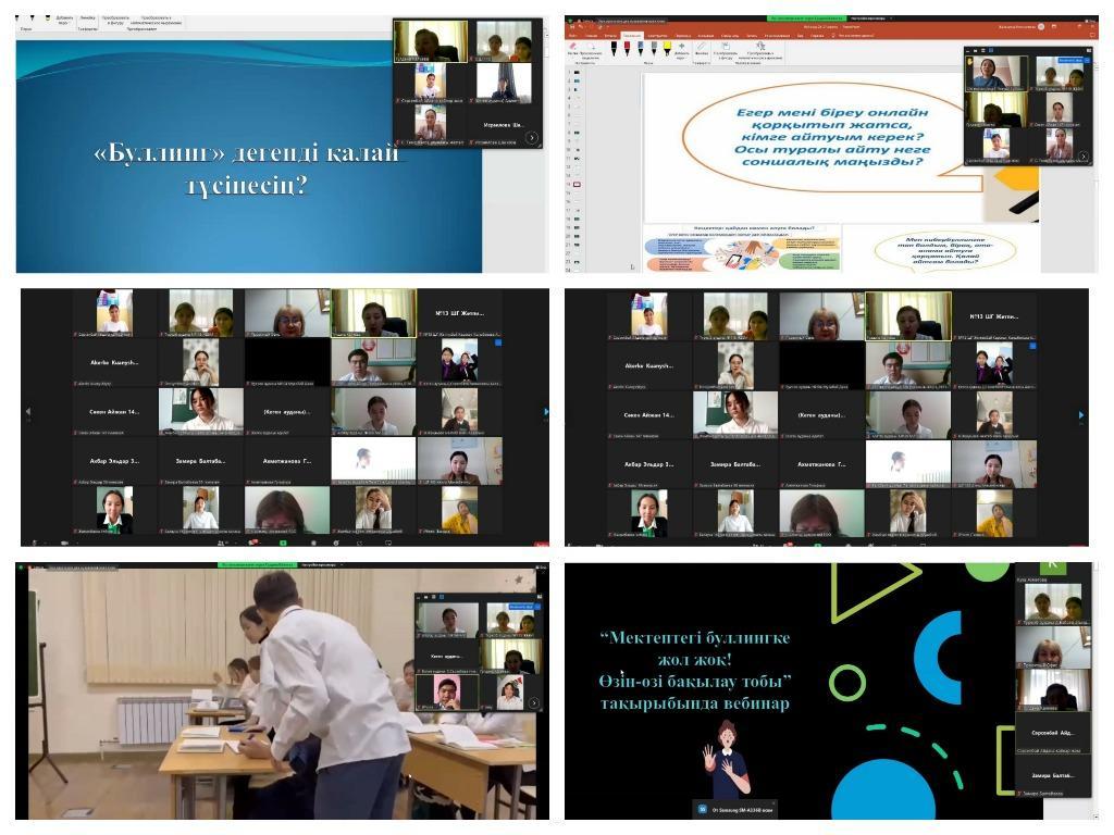 "Мектептегі буллингке жол жоқ!" тақырыбында zoom платформасында вебинар өтілді. Мектеп Парламенті ұйымының мүшелеріне психолог Калиева Гүлдана буллинг туралы ақпарат беріп, психологиялық жаттығулар жасатты.