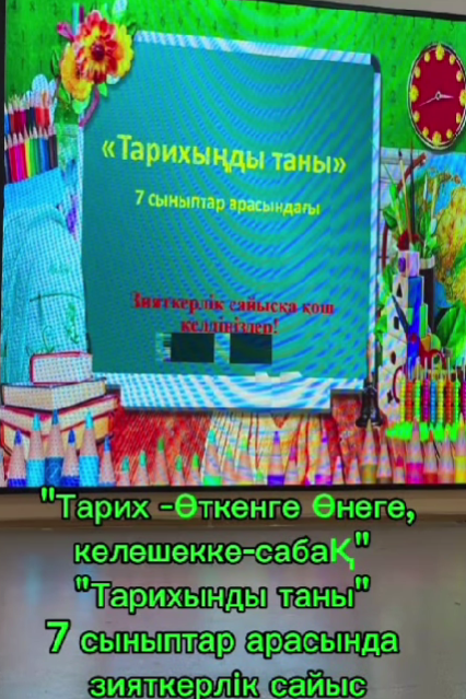 “Тарих - өткенге өнеге,келешекке -сабақ”атты тарих апталығының онкүндік аясындағы 7 сыныптар арасында “Тарихыңды таны” атты зияткерлік сайысы өтті.Тарих пәнінің мұғалімдері Терлекбаева Перизат Адилакыновна және Минахунова Керімхан Изетаевна