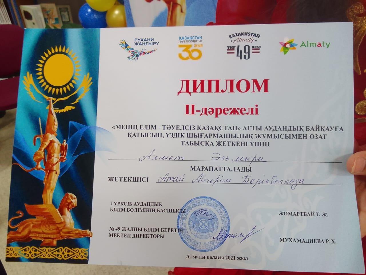 24 ноябрь 2021 0 1 2 3 4 5 Диплом "Менің елім- Тәуелсіз Қазақстан" атты аудандық байқауға қатысып , үздік шығармашылық жұмысымен озат табысқа жеткен ІІ орын Ахмет Эльмира марапатталды. Осы беттің QR-коды:QR-код этой страницы: