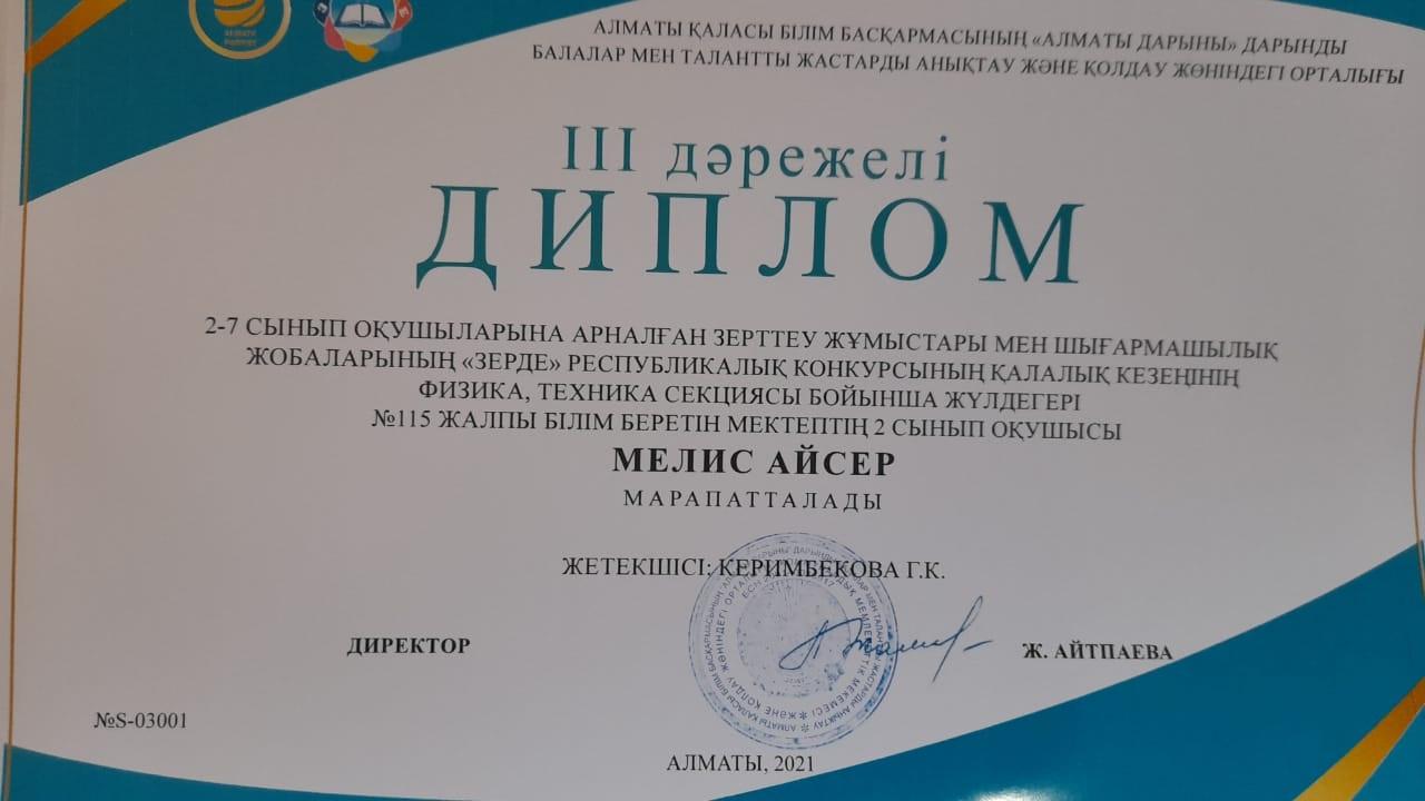 07 январь 2022 0 1 2 3 4 5 Диплом 2-7 сынып оқушыларына арналған зерттеу жұмыстары мен шығармашылық жобаларының "Зерде" республикалық конурысының қалалық кезеңінің физика, техника секциясы бойынша ІІІ дәрежелі дипломмен Мелис Айсер марапатталды. Осы беттің QR-коды:QR-код этой страницы: