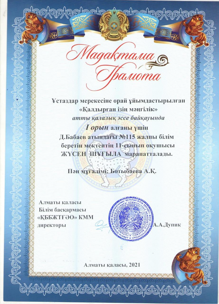 19 январь 2022 0 1 2 3 4 5 Мадақтама "Қалдырған ізін мәңгілік" атты қалалық эссе байқауында І орын иеленген Жүсен Шұғыла марапатталды. Пән мұғалімі Ботыбаева Аяулым Қайырбекқызы. Осы беттің QR-коды:QR-код этой страницы: