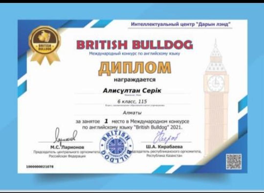 02 март 2022 0 1 2 3 4 5 Диплом "BRITISH BULLDOG" 4 сынып оқушысы Айсұлтан Серік, 1 орынмен марапатталды. Осы беттің QR-коды:QR-код этой страницы:
