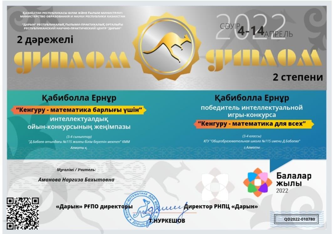 06 июль 2022 0 1 2 3 4 5 Диплом "Кенгуру- математикалық барлығы үшін" интелектуалдық ойын-конкурсының жеңімпазы Қабиболла Ернұр ІІ дәрежелі дипломмен марапаттылды. Осы беттің QR-коды:QR-код этой страницы: