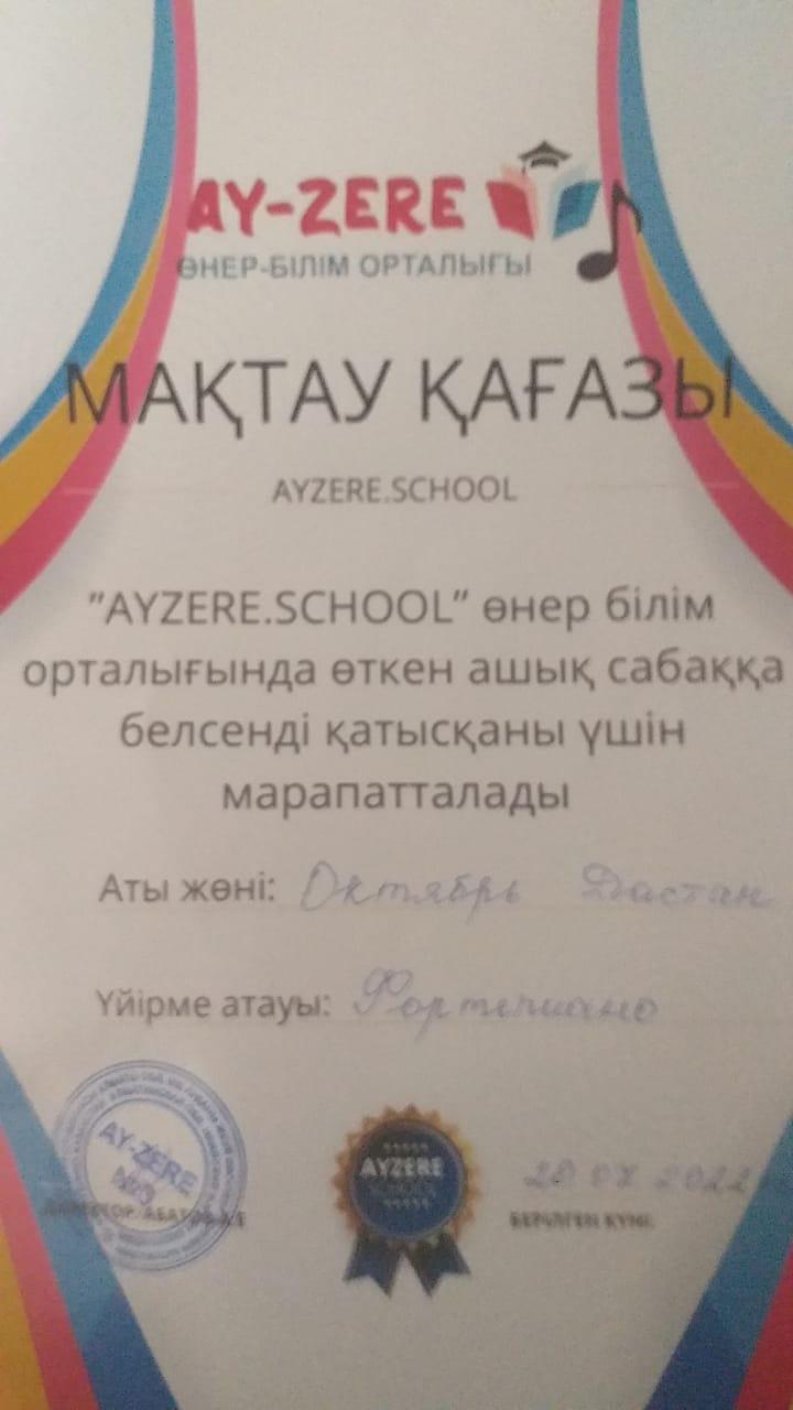 20 июль 2022 0 1 2 3 4 5 Мақтау қағазы "AYZERESCHOOL" БІЛІМ ОРТАЛЫҒЫНДА ӨТКЕН АШЫҚ САБАҚҚА БЕЛСЕНДІ ҚАТЫСҚАНЫ ҮШІН ОКТЯБРЬ ДИАС МАРАПАТТАЛДЫ. Осы беттің QR-коды:QR-код этой страницы: