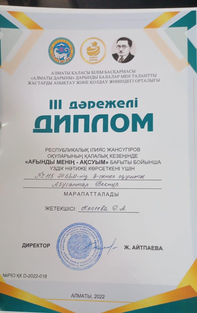 31 август 2022 0 1 2 3 4 5 Диплом Республикалық Іляс Жансүгіров оқуларының қалалық кезеңінде "Ағынды менің-Ақсуым" бағыты бойынша ІІІ дәрежелі дипломмен Абусаттар Бекнұр марапатталды. Осы беттің QR-коды:QR-код этой страницы: