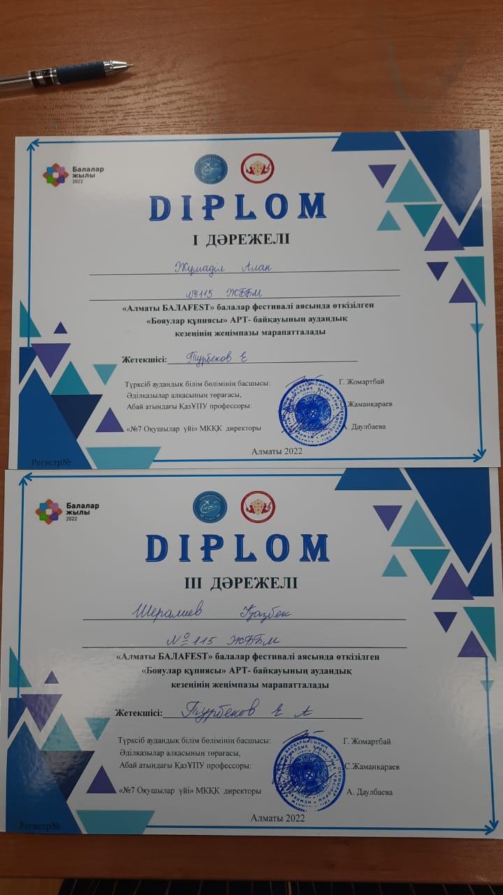 27 август 2022 0 1 2 3 4 5 Диплом "Алматы БАЛАFEST" БАЛАЛАР" балалар фестивалі аясында өткізілген "Бояулар құпиясы АРТ- байқауының" І, ІІІ дірежелі дипломмен Жұмадыл Алан, Шералиев Қазбек марапатталды. Осы беттің QR-коды:QR-код этой страницы: