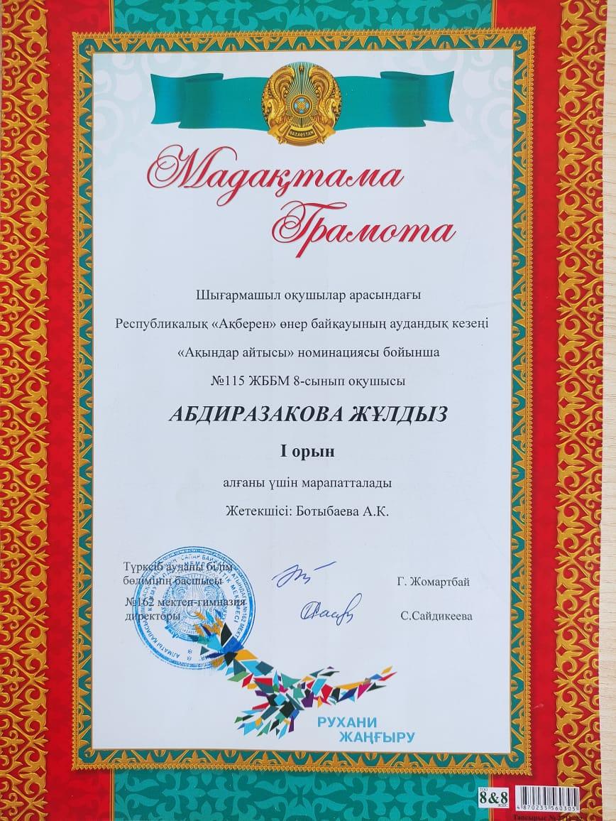 Шығармашыл оқушылар арасындағы Республикалық "Ақберен" өнер байқауының аудандық кезеңі "Ақындар айтысы" номинациясы бойынша Д.Бабаев атындағы №115 жалпы білім беретін мектептің 8 сынып оқушысы Абдиразакова Жұлдыз I орын алғаны үшін марапатталды. Жетекшісі: Ботыбаева А.К.