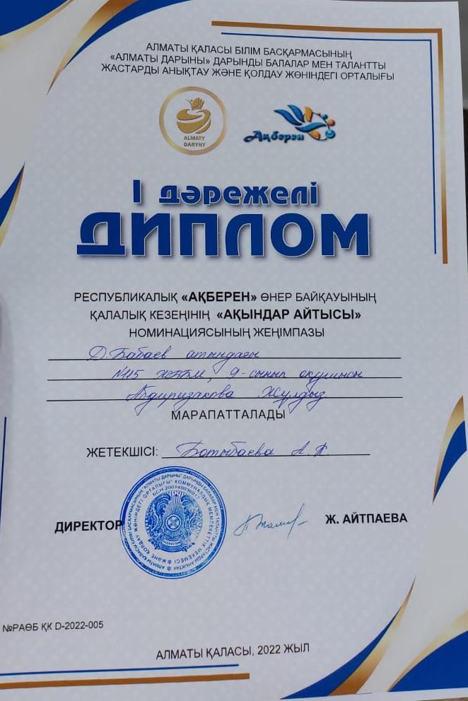 22 октябрь 2022 0 1 2 3 4 5 I дәрежелі дипломмен марапатталды I дәрежелі дипломмен марапатталдыМектебіміздің 9 сынып оқушысы Абдиризакова Жұлдыз Республикалық «Ақберен» өнер байқауының қалалық кезеңінің «Ақындар айтысы» номинациясының жеңімпазы атанды. Жетекшісі: Ботыбаева А.К. Құттықтаймыз! Осы беттің QR-коды:QR-код этой страницы: