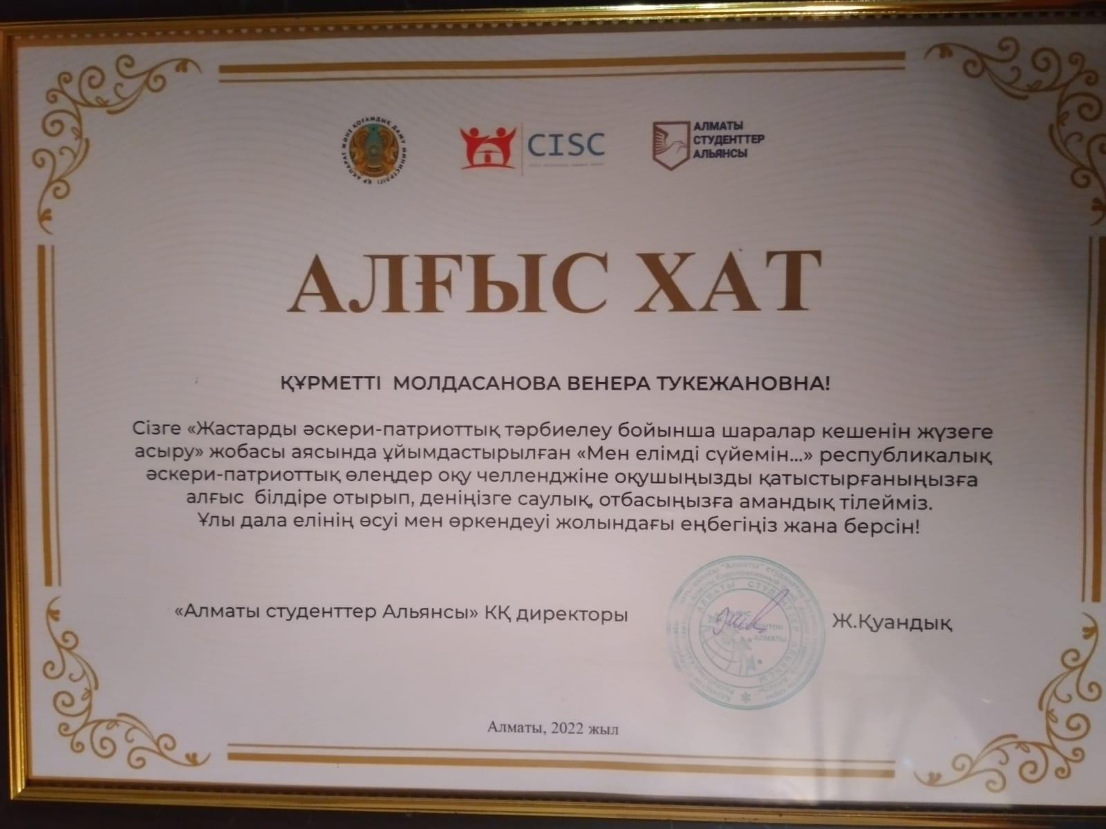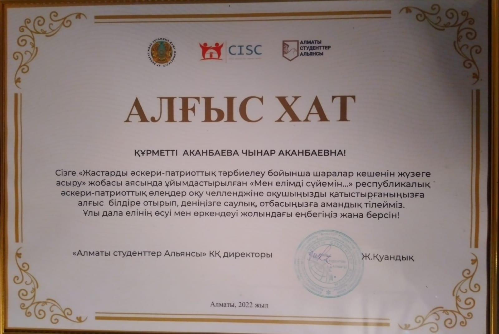 "Мен елімді сүйемін..." атты республикалық әскери- патриоттық қашықтан өлеңдер оқу челленджінің қорытынды бойынша мектебіміздің оқушылары үздік болып топ жарды. Оқушылар алғыс хатпен, кітап алу дүкендеріне арнайы сертификатпен марапатталды. Сынып жетекшілері алғыс хатпен марапатталды.