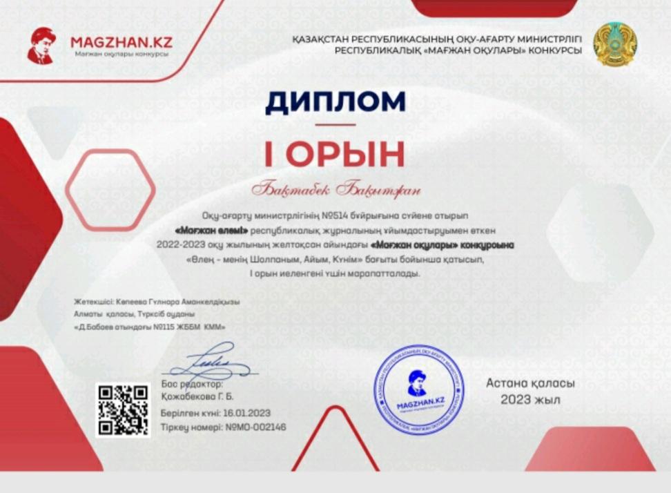 Оқу-ағарту министрлігінің №514 бұйрығына сүйене отырып «Мағжан әлемі» республикалық журналының ұйымдастыруымен өткен 2022-2023 оқу жылының желтоқсан айындағы «Мағжан оқулары» конкурсына «Өлең менің Шолпаным, Айым, Күнім» бағыты бойынша қатысып, дипломмен марапатталды. Жетекшісі: Көпеева Гүлнара . Құттықтаймыз!
