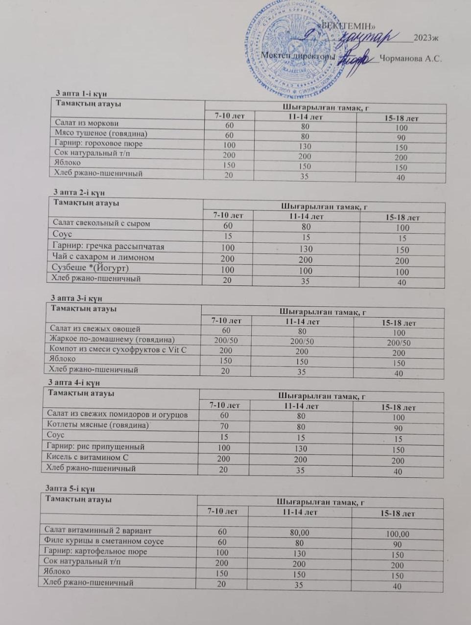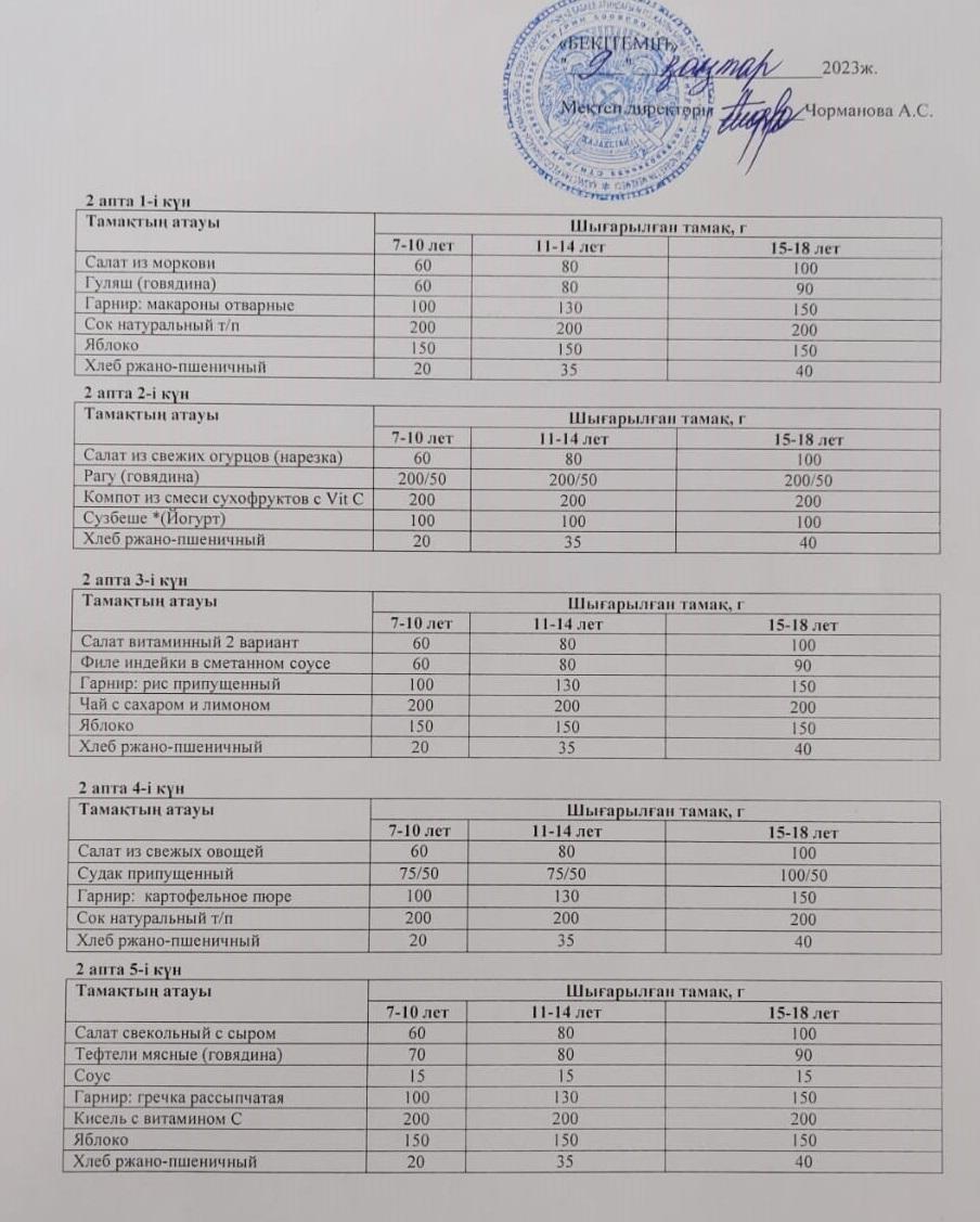 2023 жылдың бекітілген ас мәзірі